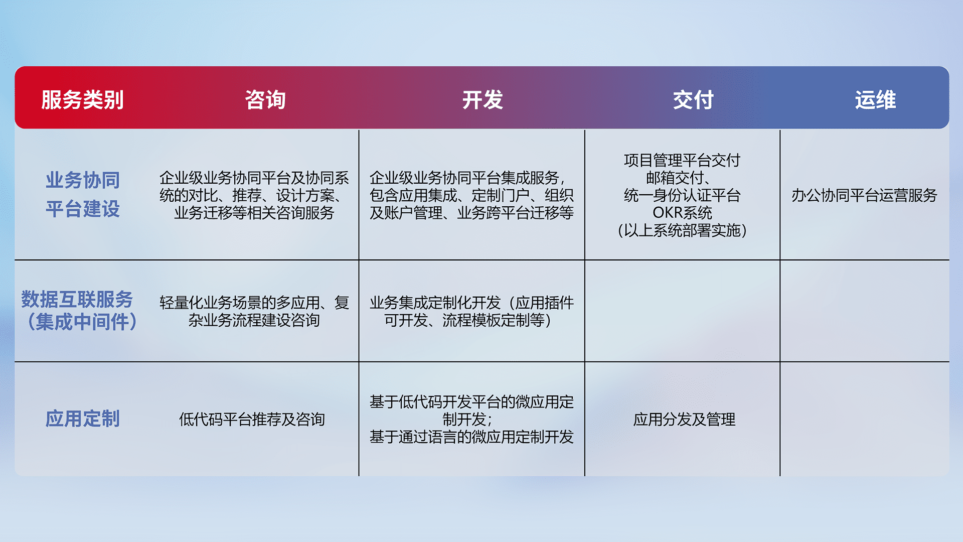 针对钉钉、、企微、、IDaas等平台级产品提供产品的规划、、、、方案、、、交付、、定制化开发等服务,,,,实现如统一协同办公、、、智能客户服务、、混合会议管理、、、、智能数据查询、、、、等业务场景,,,,实现数字化转型。。。。